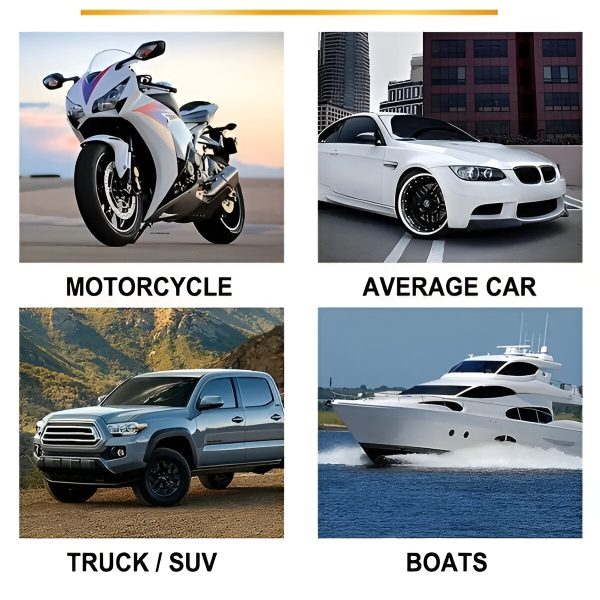 Verwenden Sie CARCOAT für Autos, Boote, Motorräder, Wohnmobile, ATVs und mehr. Es ist sicher für alle Oberflächen, einschließlich Lack, Kunststoff und Glas.