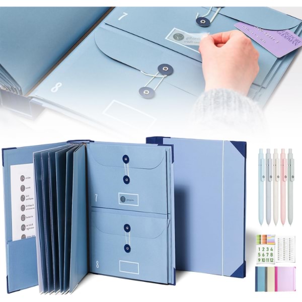 Enthält 10 erweiterbare Umschläge (6 in voller Größe, 4 halbe Größe), die jeweils bis zu 10 Blatt fassen.