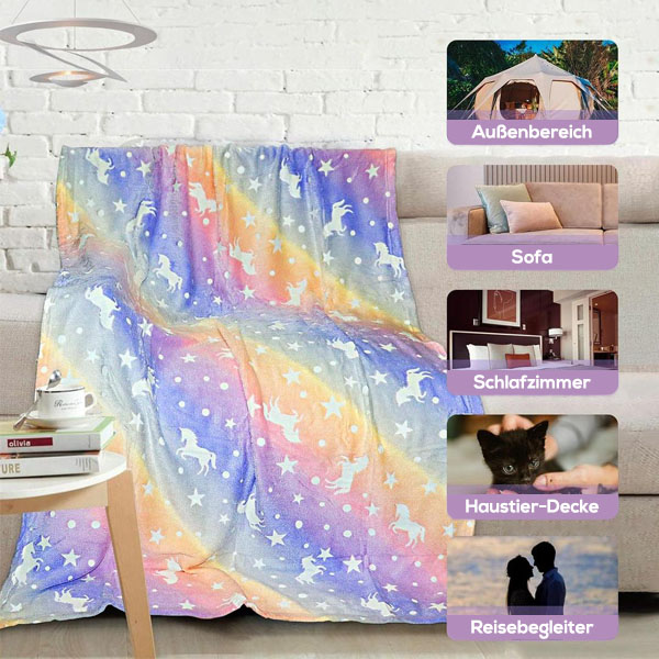 Eine kuschelige und warme decke, die in der nacht licht abgibt! Du kannst entweder ein einhorn- oder ein dinosaurier-muster wählen!
