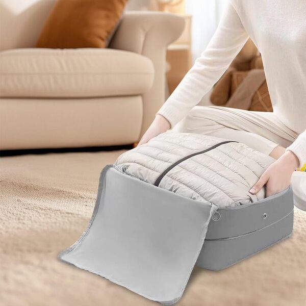 Komprimiere Kleidung, Decken und vieles mehr mühelos und ohne Vakuum und schaffe so jede Menge zusätzlichen Platz in deinem Koffer oder Kleiderschrank.