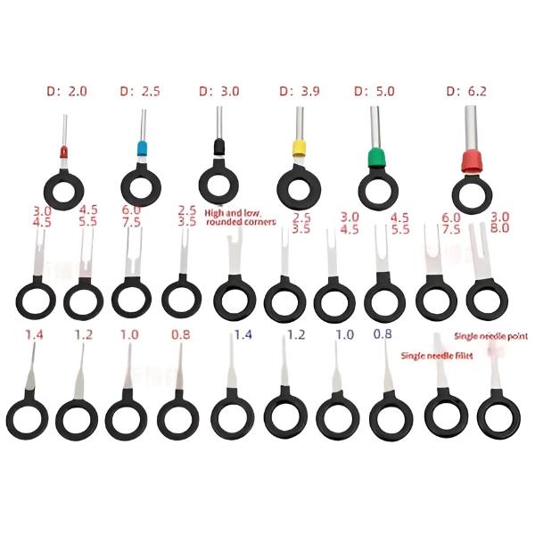 Enthält Einzel- und Doppelstiftauszieher und Gusswerkzeuge in verschiedenen Größen, um die Kompatibilität mit einer Vielzahl von Steckern zu gewährleisten, ob in Autos oder elektronischen Geräten.